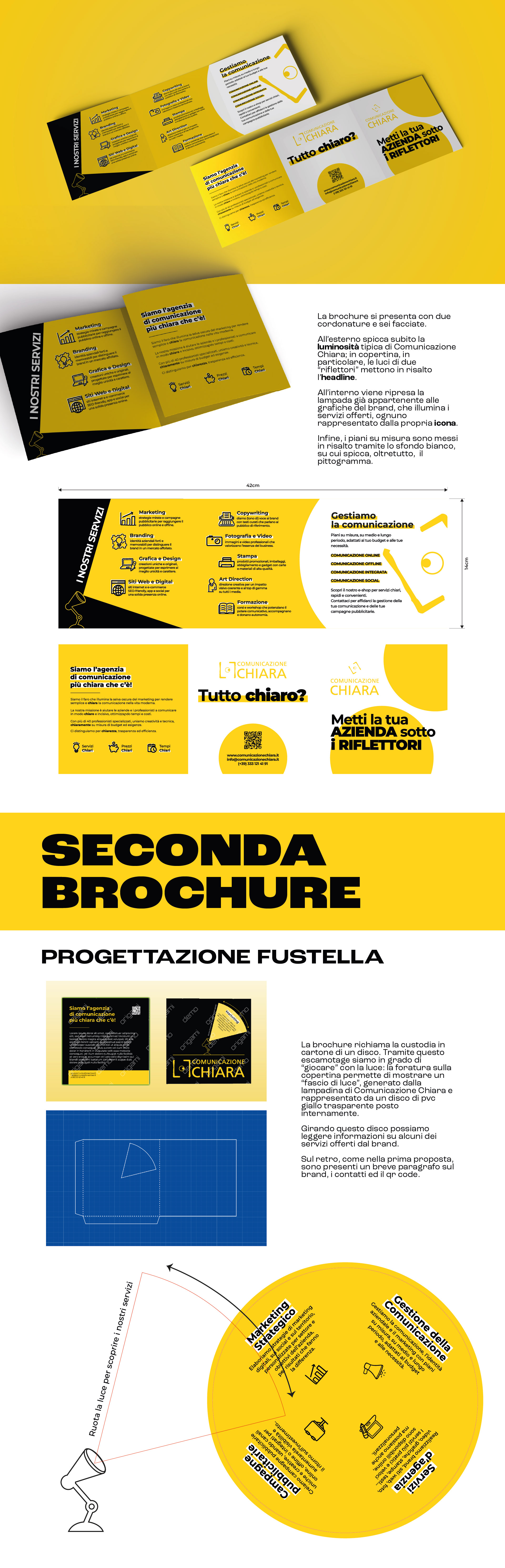 Comunicazione Chiara is a communication studio focused on clear and effective messaging. I was involved in two distinct projects, both aimed at promoting their services through printed materials. The first was a clean and accessible brochure designed for everyday distribution, with a focus on clarity and immediate readability. The second project was a more articulated piece, where I developed both the graphic design and the die-cut structure. Conceived as a showcase of the studio’s capabilities, the brochure features a custom-designed layout inspired by the brand identity, combining functionality with a more refined and expressive visual approach.